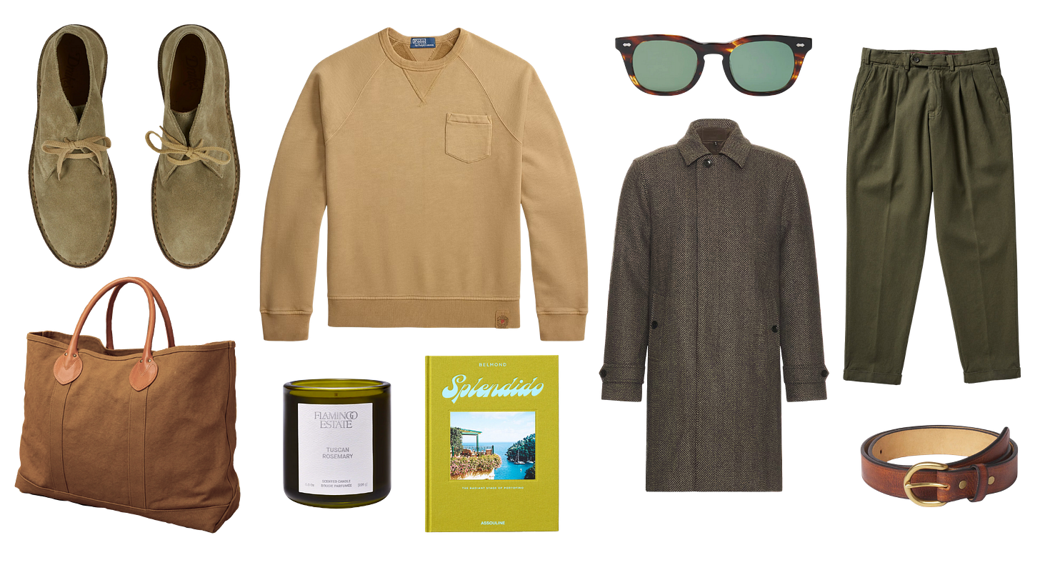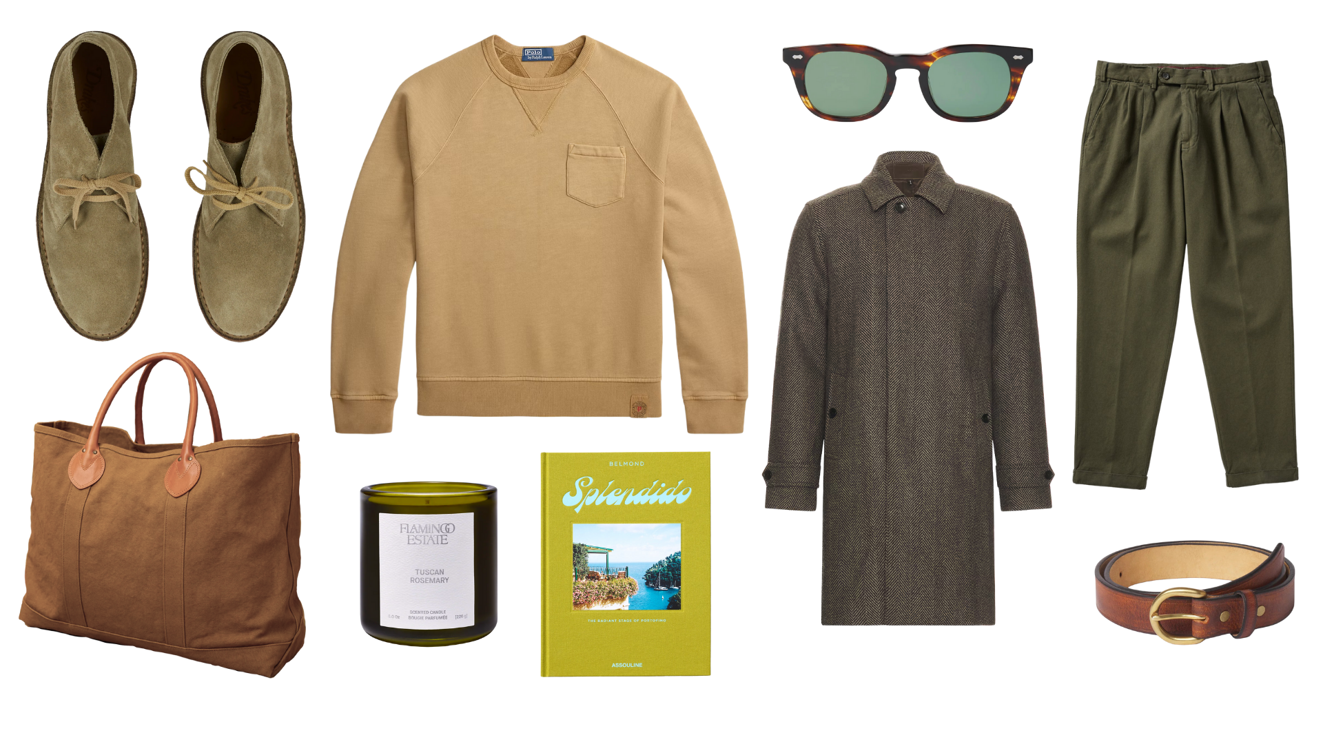 Drakes Desert Boot // Fortela Canvas Tote // Ralph Lauren Crew Neck // Flamingo Estate Tuscan Rosemary Candle // Splendido X Assouline Book // Paige Herringbone Coat ( use code RILEY15 ) // Velasca Cingoli Pant // Buck Mason Glasses // Belt